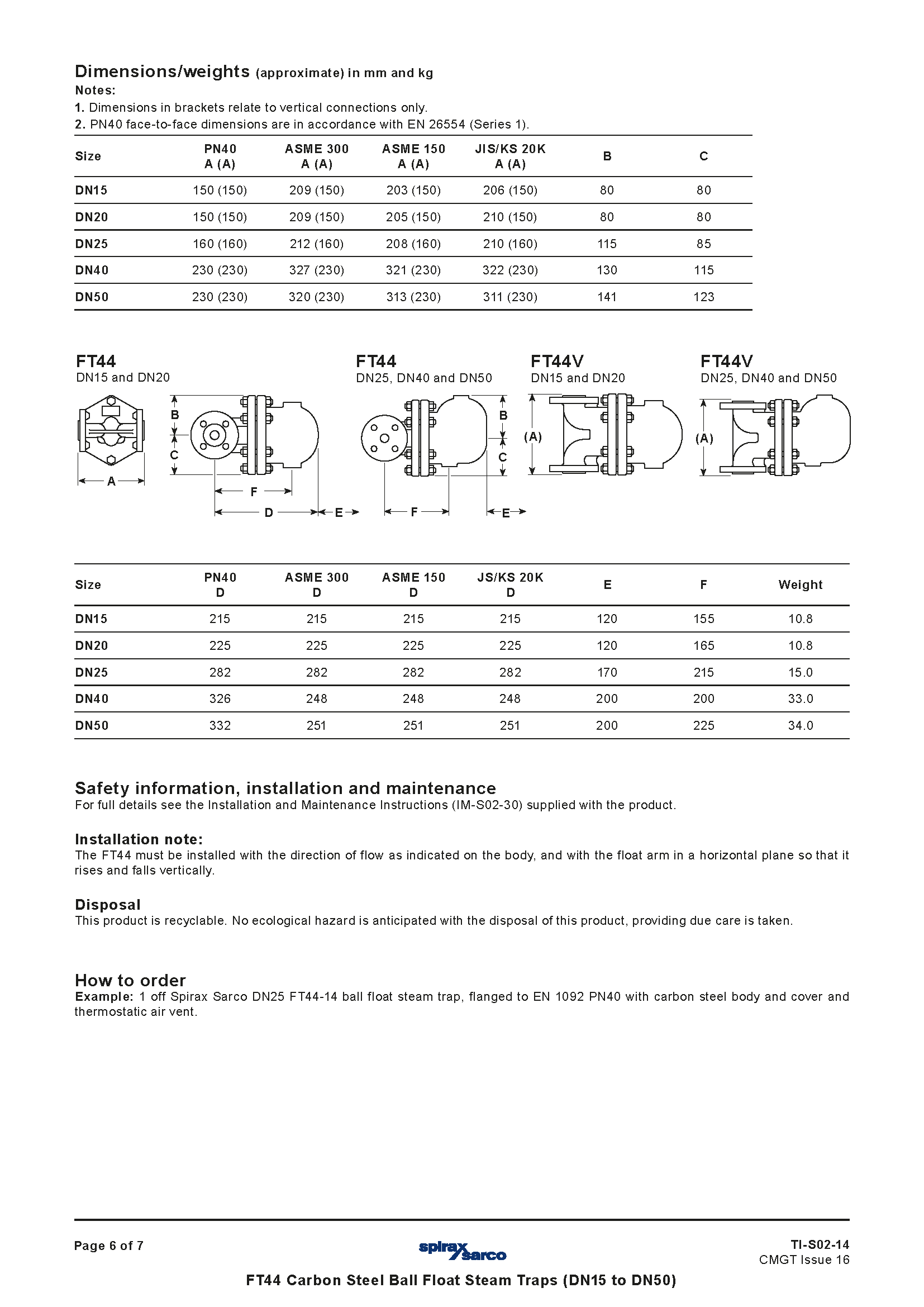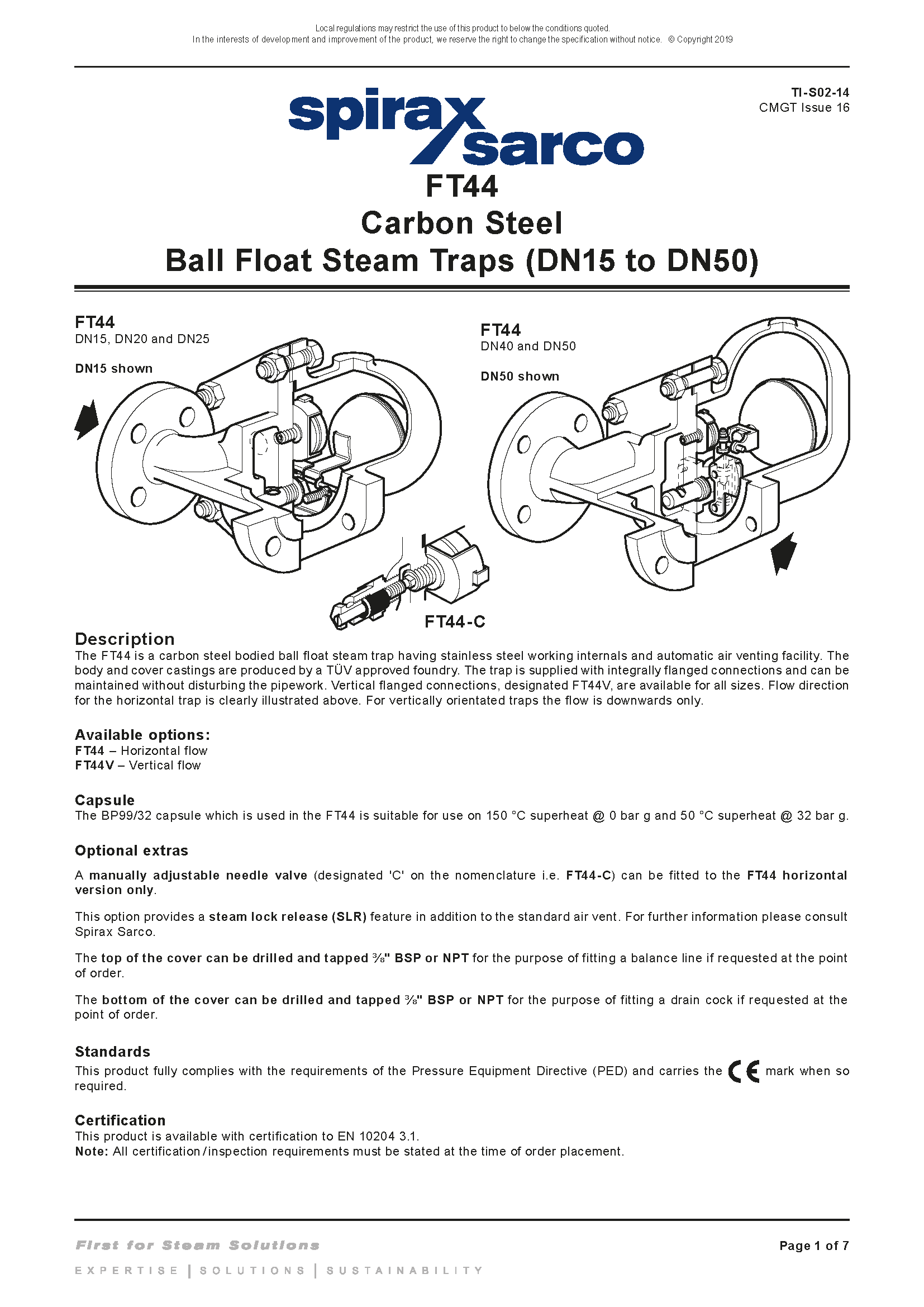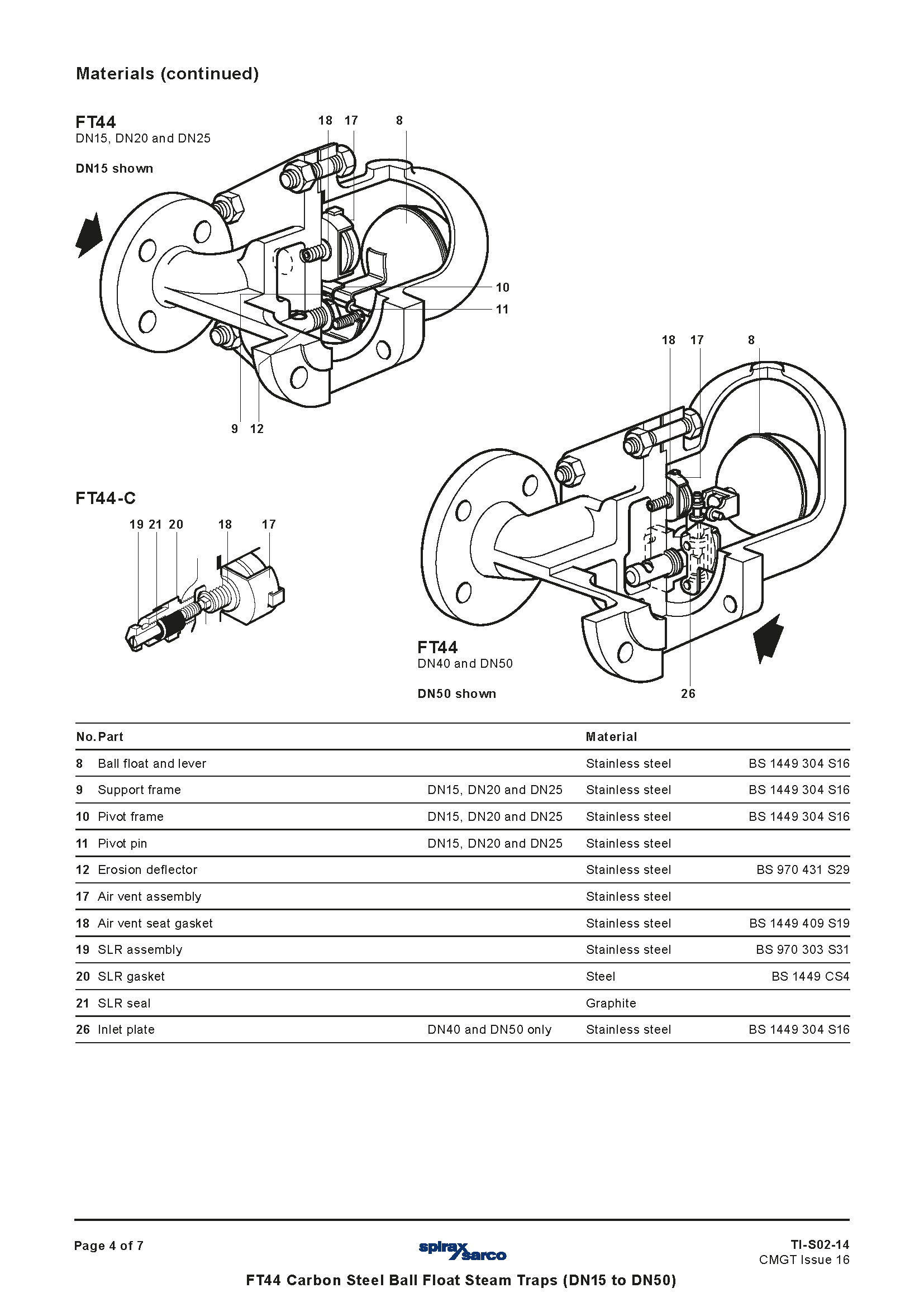 Bẫy hơi phao bi thép carbon Spirax Sarco FT44 (DN15 đến DN50) TI-S02-14